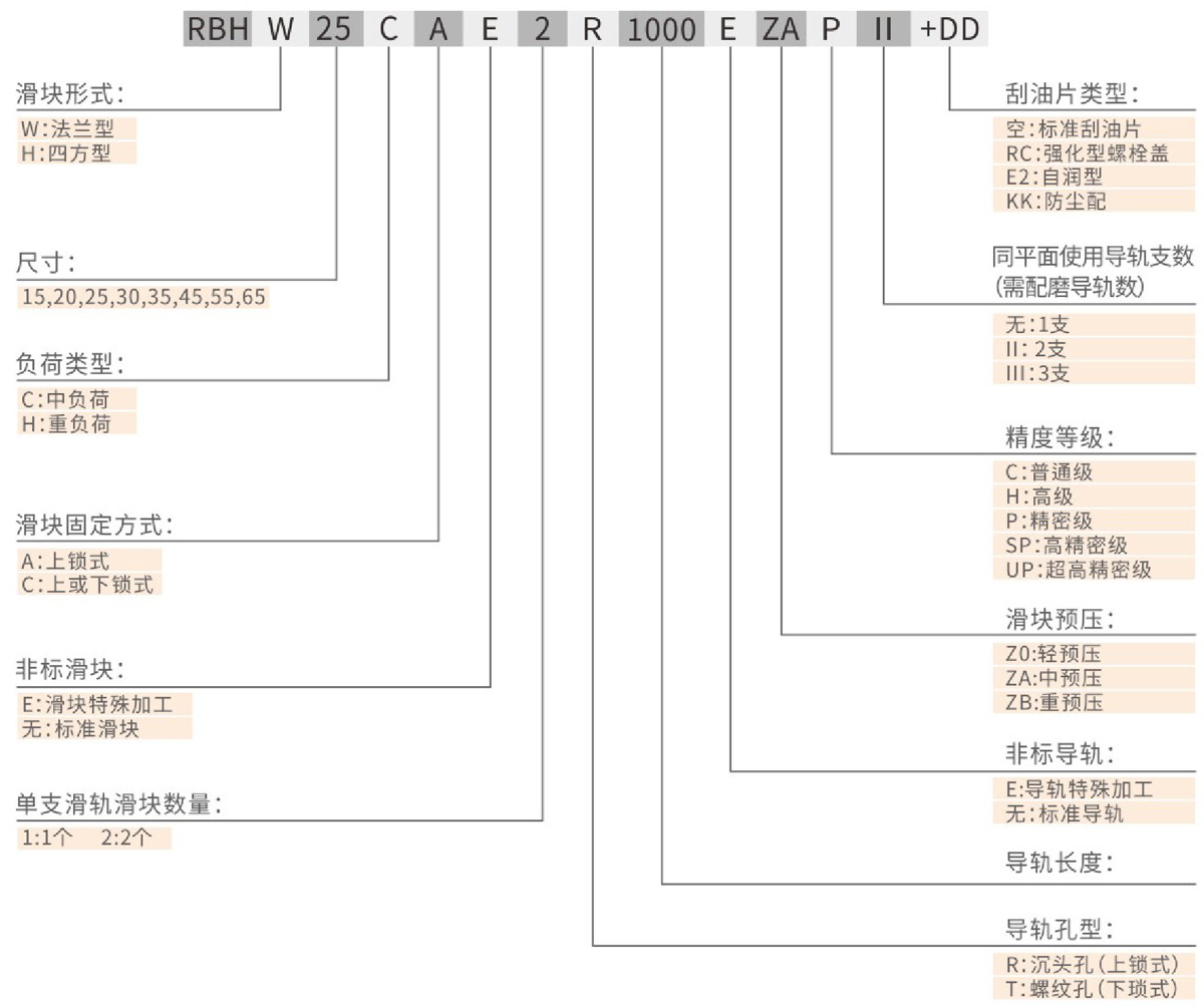 RB series linear guide with roller type rolling body instead of steel balls, for the realization of ultra-high rigidity and super heavy load capacity, through the rolling body and guide and slider linear contact way; so that the rolling body in bearing high load only form a trace of elastic deformation, but also by 45 degrees of contact angle design, so that the overall linear guide to achieve four directions, such as high rigidity, such as high load capacity characteristics of performance, through the ultra-high rigidity of Achievement, can greatly enhance the processing accuracy, to achieve high precision requirements; because of the characteristics of the super heavy load, and thus extend the service life of linear guide, very suitable for high-speed automated industrial machinery and high rigidity needs of equipment use.